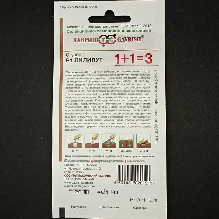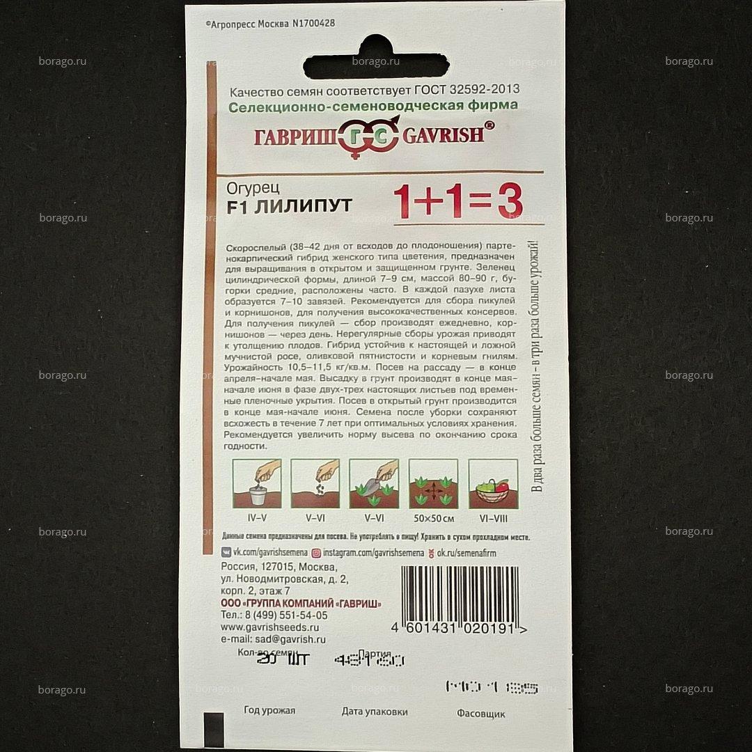 Огурец "Лилипут", F1, пикуль, срия "1+1", 20 шт. Гавриш.