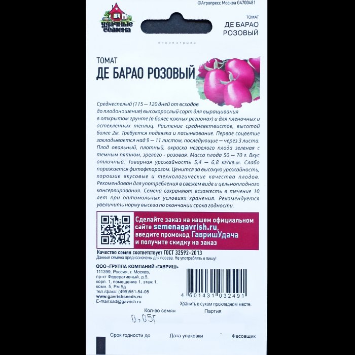 Томат "Де Барао розовый", серия "Удачные семена", 0,1 гр. Гавриш.