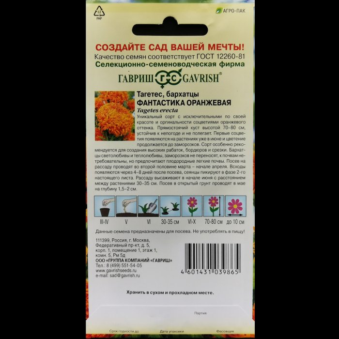 Бархатцы (тагетес) "Фантастика оранжевая", прямостоячие, 0,1 гр. Гавриш.