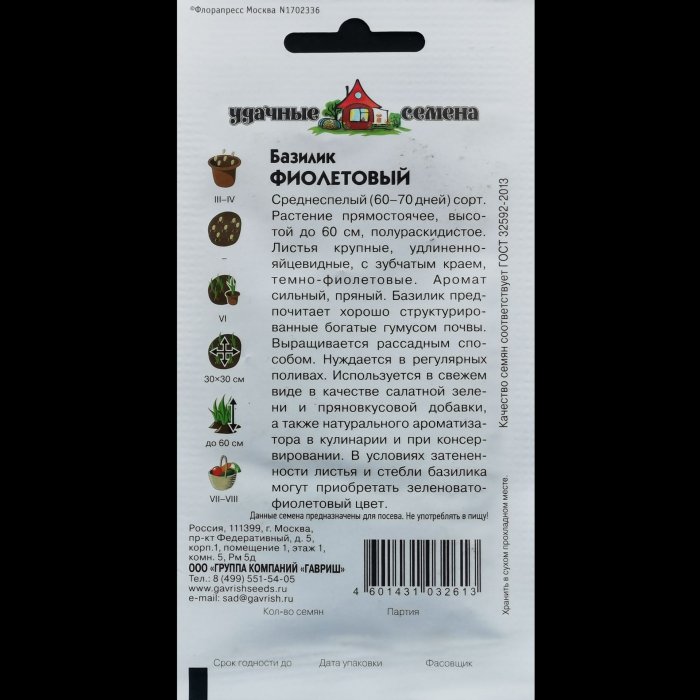 Базилик "Фиолетовый", серия "Удачные семяна", семян больше, 0,6 гр. Гавриш.