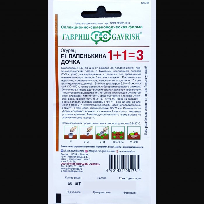 Огурец "Папенькина дочка", F1, серия "1+1", 20 шт. Гавриш.