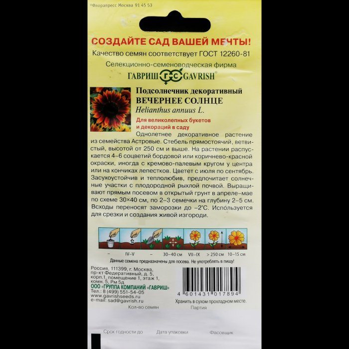 Подсолнечник "Вечернее солнце", декоративный, 0,5 гр. Гавриш.