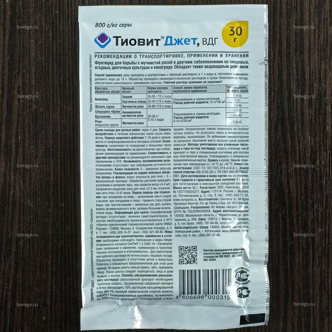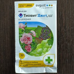 «Тиовит Джет» является препаратом акарицидного и фунгицидного действия. Он защищает садово-огородные культуры от грибковых заболеваний, насекомых и клещей. Действие препарата заметно уже через несколько часов после применения.