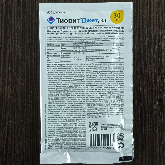 Период защитного действия, в зависимости от погоды и степени поражения культур, составляет 7–10 дней. Средство не подавляет жизнедеятельности растений, рассчитано на гибкие сроки применения. «Тиовит Джет» безвреден для человека, животных, пчел. Препарат не требует длительного периода ожидания: через день после обработки культур можно собирать урожай.